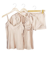 You will never go wrong with this summer sleepwear set! The comfortable and glamorous looking Lucy set comes in light beige colour with a delicate embroidery of a crown on the pocket. You will certainly feel like a queen in this set! Composed of a short sleeved top, sleeveless and pair of shorts. This set ensures you the sweetest dreams and the most glamorous mornings.