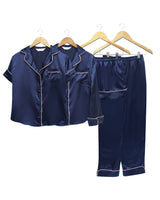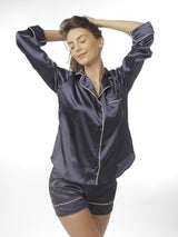 The classic, comfortable and glamorous looking Monica Set comes in Scarlet, Emerald Green and Midnight Blue. Composed of a short sleeve, long sleeve top, a pair of shorts and pants. This set ensures you the sweetest dreams and the most glamorous mornings.