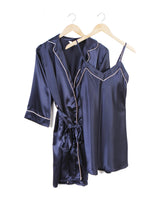 The comfortable and glamorous looking Natalia set comes in old rose, maroon, emerald green and midnight blue. Composed of a long sleeve robe with a collar and dainty dress. This set ensures you the sweetest dreams & the most glamorous mornings. Perfect for the bride-to-be!