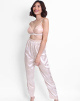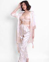 The comfortable and glamorous looking Julia Bralette, Pants & Robe set has a sophisticated peachy beige lace.