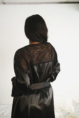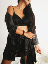 Consists of a lace bralette, shorts and robe. Each piece has a lace detail.
