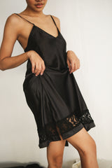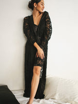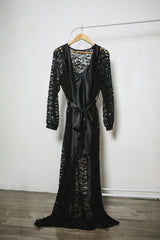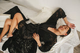 Consists of a full lace robe from top to bottom with black satin edges on the front, cuffs and the belt. The midi dress is in black with lace details.This set ensures you the sweetest dreams and the most glamorous mornings, truly made for the queens.