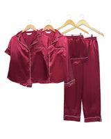 The classic, comfortable and glamorous looking Monica Set comes in Scarlet, Emerald Green and Midnight Blue. Composed of a short sleeve, long sleeve top, a pair of shorts and pants. This set ensures you the sweetest dreams and the most glamorous mornings.
