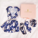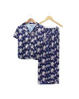 Stay comfortable and glamorous in your exclusively designed sleepwear set with a colourful floral design on sophisticated dark sapphire set.. This set consists of a short sleeve top and a pair of pants. It’s a limited edition set that ensures you’ll have the sweetest dreams and the most glamorous mornings.