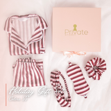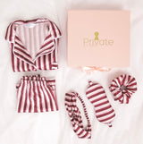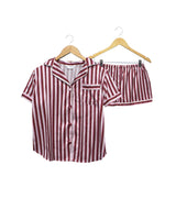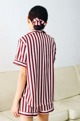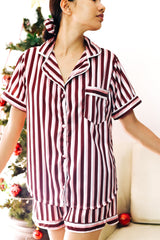 Stay comfortable and glamorous in your exclusively designed sleepwear set with a very playful burgundy, blush and white stripes.. This set consists of a short sleeve top and a pair of shorts. It’s a limited edition set that ensures you’ll have the sweetest dreams and the most glamorous mornings.