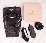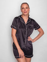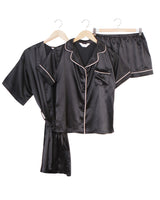 The classic, comfortable and glamorous looking Daniella black set comes in black. Composed of short sleeves, pair of shorts and robe. This set ensures you the sweetest dreams and the most glamorous mornings.
