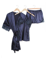 - The comfortable and glamorous looking Elise set comes in midnight blue. Composed of a sleeveless top, pair of shorts and robe. This set ensures you the sweetest dreams and the most glamorous mornings!
